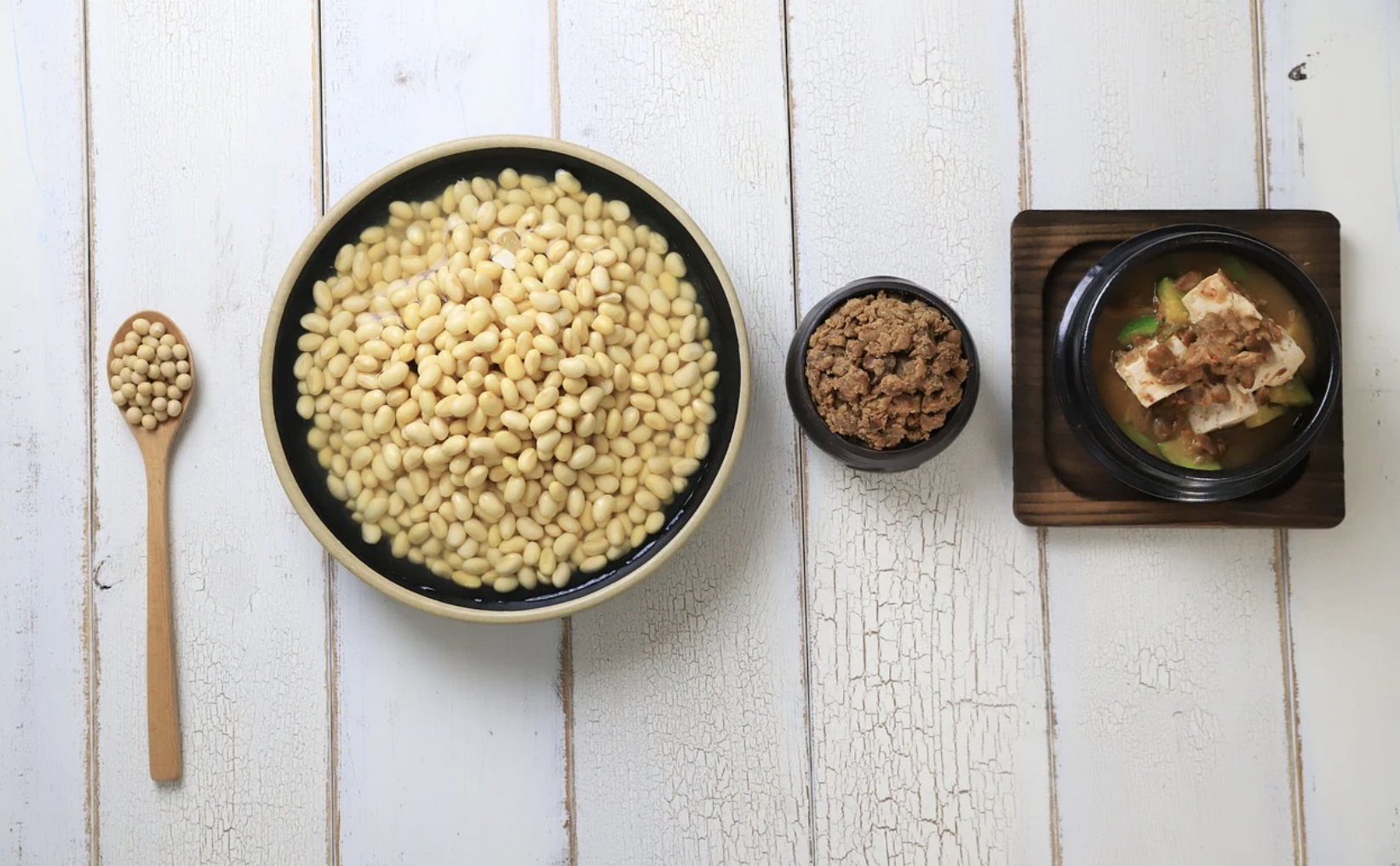 청국장은 들어봤는데 생청국장은 무엇인지 궁금하실 텐데요, 마트에서 청국장 덩어리는 파는 거 보셨지요? 여러분이 청국장 끓이기 위해서 구입하신 청국장은 생청국장에 소금과 간을 해서 찌개로 바로 끓여 먹을 수 있도록 만든 것이고 생청국장은 삶은 콩을 발효한 상태 그대로의 것입니다. 일본 낫토와 비슷한데 둘 다 바실러스 서브틸리스라는 고초균으로 발효시킵니다. 그런데 낫토는 고초균 중에서도 바실러스 서브틸리스 낫토라는 한 종류의 균만 접종해서 표준화가 되어 있는 반면에 청국장은 고초균에 속하는 여러 균들이 한꺼번에 발효에 작용한다는 차이점이 있습니다.