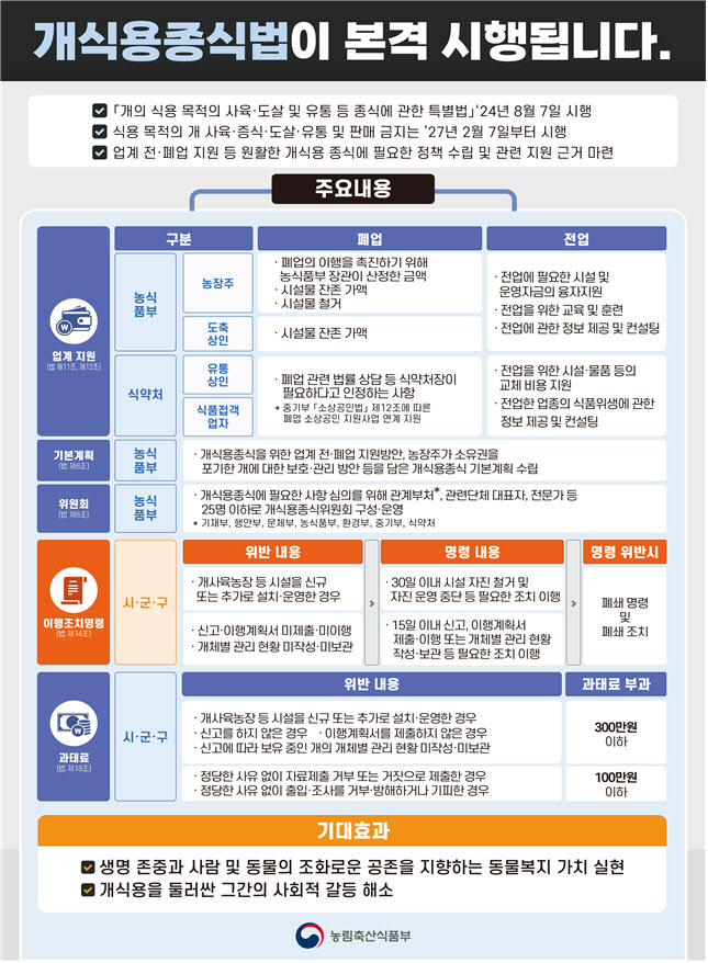농림축산식품부는 8월 6일 개식용종식법 시행령안이 8월 7일부터 시행된다고 밝혔습니다.