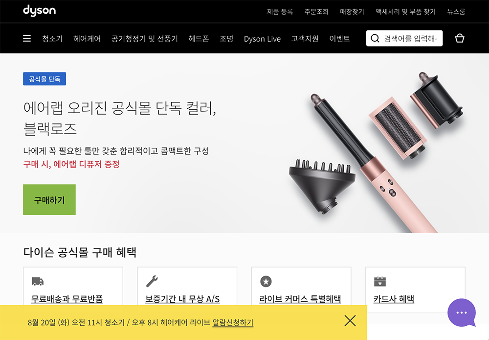 다이슨 공식홈페이지를 보시면 홈페이지 하단에 라이브 알람신청하기 메시지가 있습니다.
