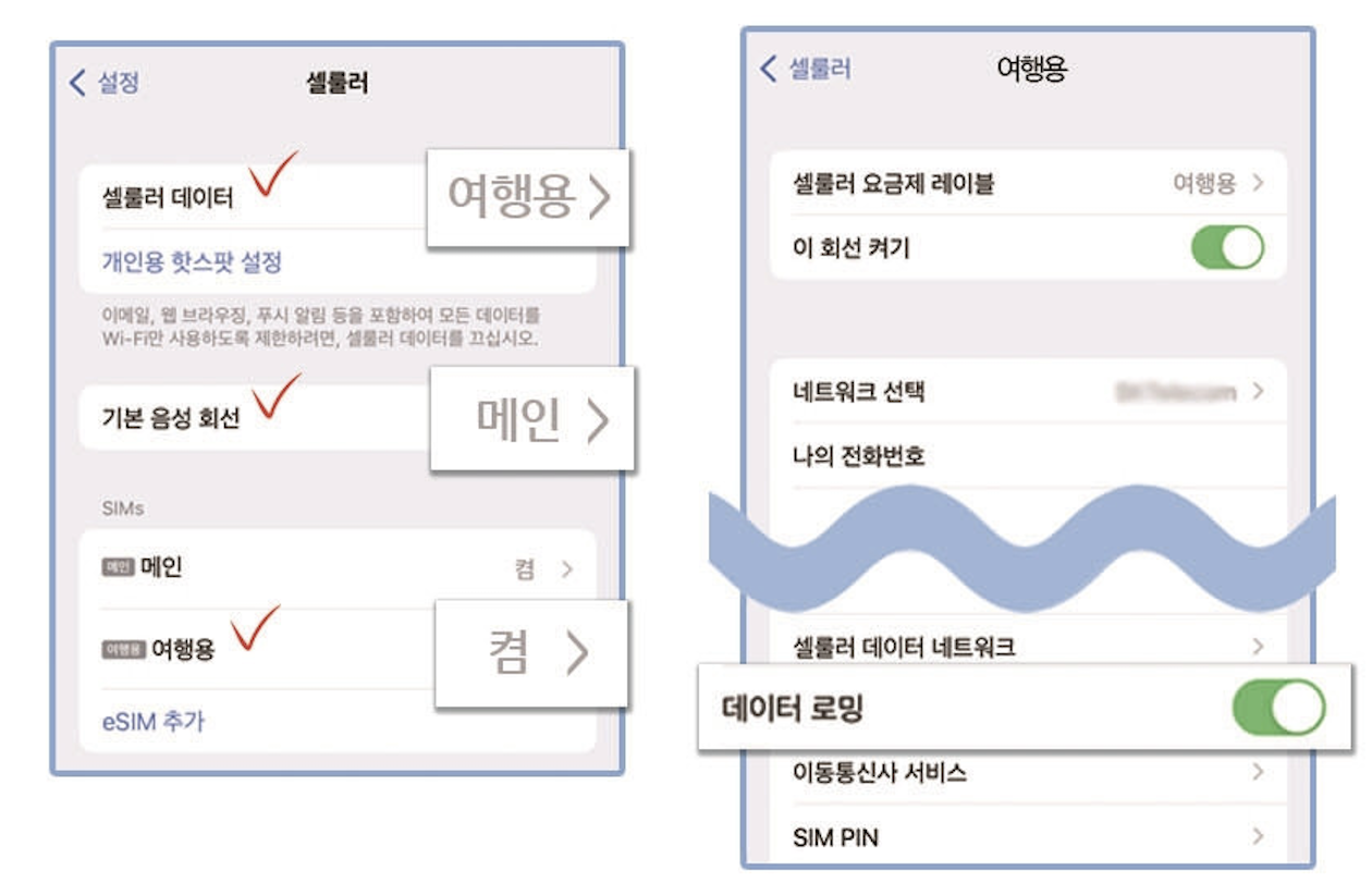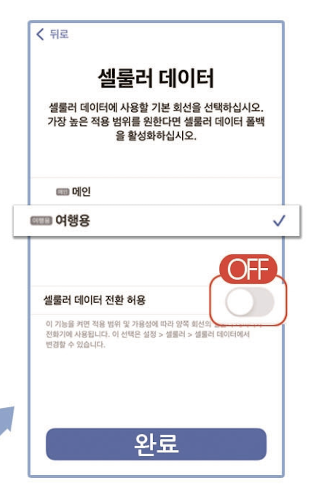셀룰러 데이터는 여행용으로 설정하고 셀룰러 데이터 전환 허용은 OFF로 합니다.