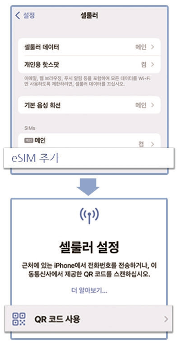 1. 설정-셀룰러-eSIM추가-QR코드 사용 선택