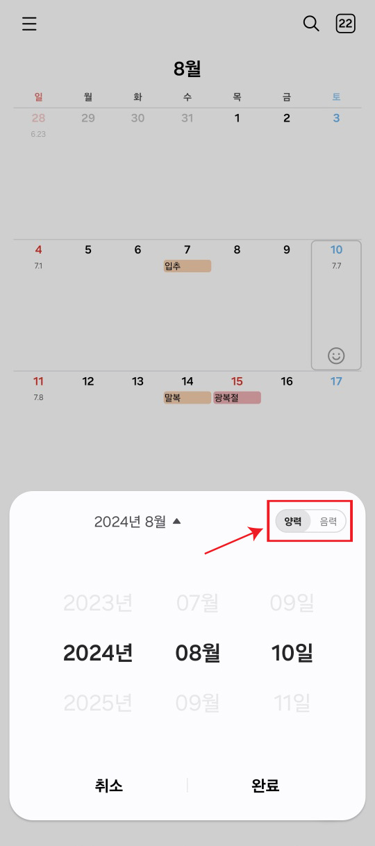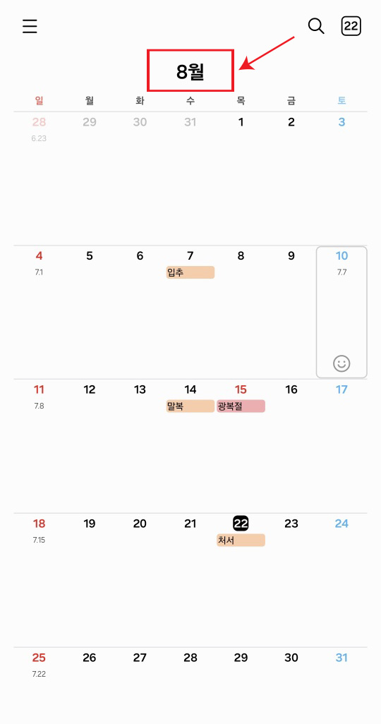 달력앱에서 월 부분을 누릅니다. 지금은 8월이니까 8월을 누르면 됩니다.