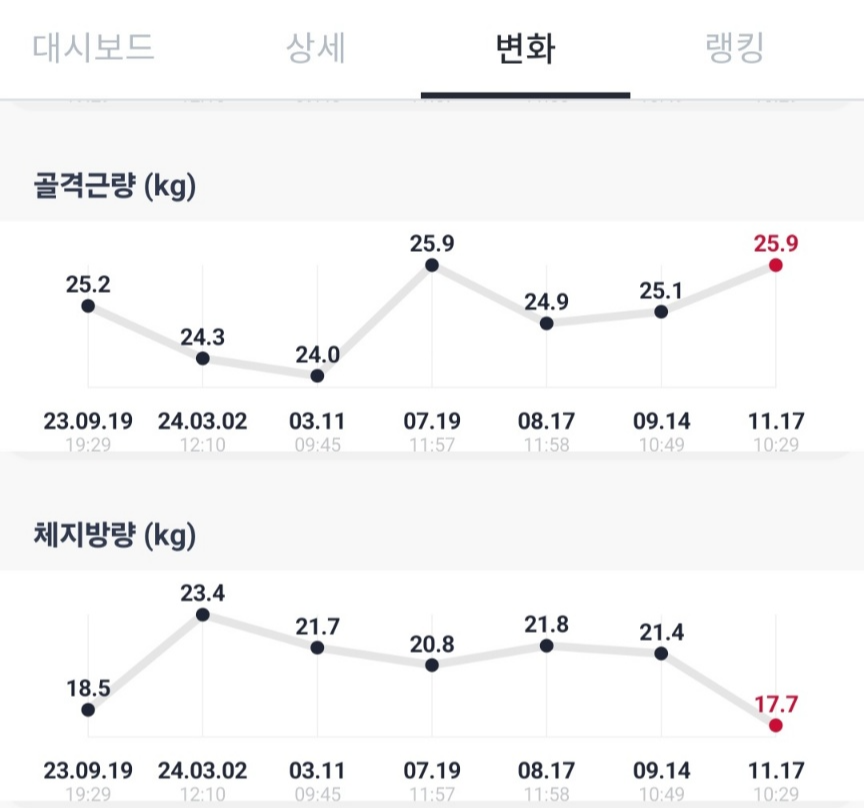3주만에 골격근은 늘어나고 체지방은 쭉 빠진 그래프를 보고 진짜 놀라지않을 수 없습니다~