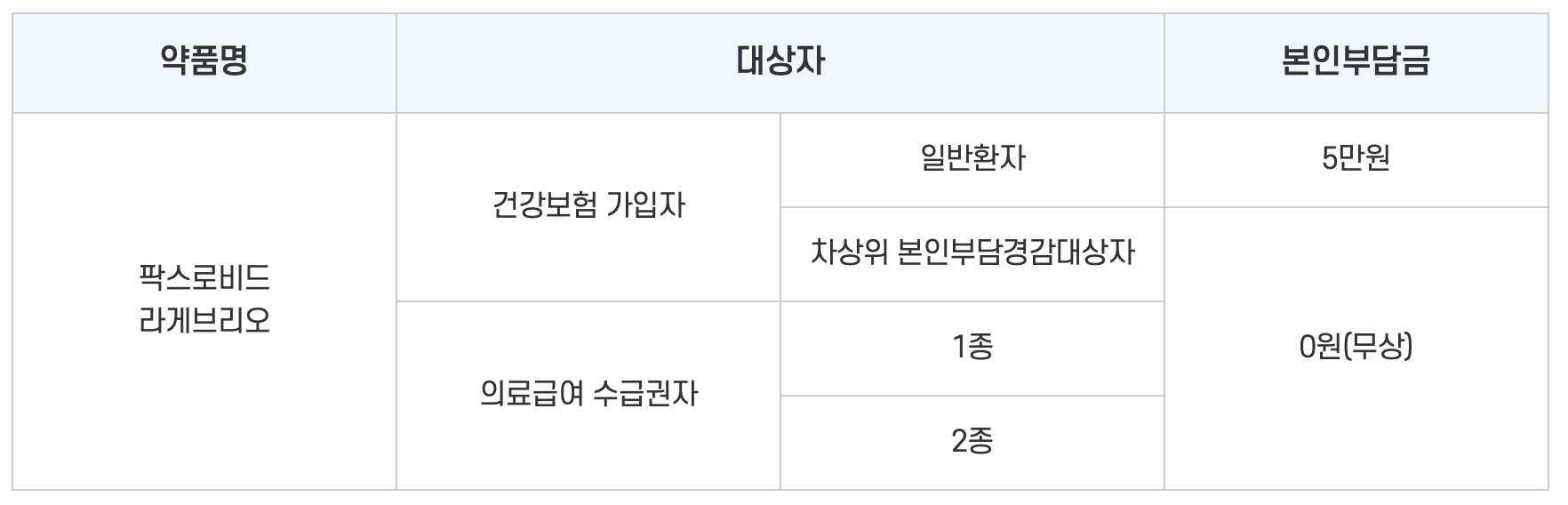 1명분 기준 - 팍스로비드: 30정/5일 치, 라게브리오 40정/5일 치 (의료급여 수급권자(1, 2종) 차상위 본인부담금경감대상자 외에는 유상 지원 대상자에 해당)