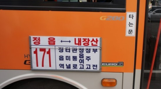 그곳에서 노란색 171번 버스를 타면 내장산 입구까지 갑니다.